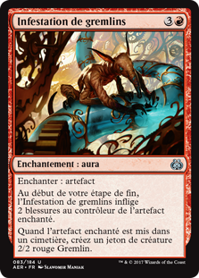 | Rules | Enchant artifact At the beginning of your end step, Gremlin Infestation deals 2 damage to enchanted artifact's controller. When enchanted artifact is put into a graveyard, create a 2/2 red Gremlin creature token. |