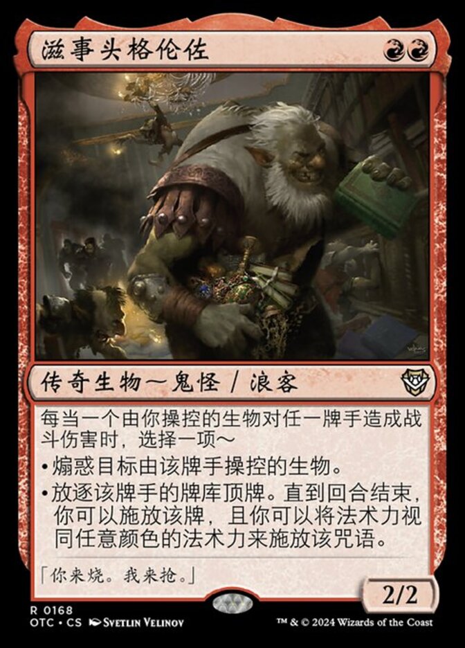 | Rules | Whenever a creature you control deals combat damage to a player, choose one — • Goad target creature that player controls. • Exile the top card of that player's library. Until end of turn, you may cast that card and you may spend mana as though it were mana of any color to cast that spell. |