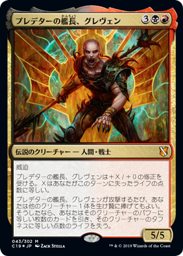 | Rules | Menace Greven, Predator Captain gets +X/+0, where X is the amount of life you've lost this turn. Whenever Greven attacks, you may sacrifice another creature. If you do, you draw cards equal to that creature's power and you lose life equal to that creature's toughness. |