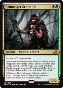 | Rules | Trample Whenever Grim Flayer deals combat damage to a player, look at the top three cards of your library. Put any number of them into your graveyard and the rest back on top of your library in any order. Delirium — Grim Flayer gets +2/+2 as long as there are four or more card types among cards in your graveyard. |