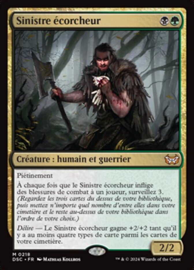 | Rules | Trample Whenever Grim Flayer deals combat damage to a player, look at the top three cards of your library. Put any number of them into your graveyard and the rest back on top of your library in any order. Delirium — Grim Flayer gets +2/+2 as long as there are four or more card types among cards in your graveyard. |