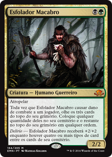| Rules | Trample Whenever Grim Flayer deals combat damage to a player, look at the top three cards of your library. Put any number of them into your graveyard and the rest back on top of your library in any order. Delirium — Grim Flayer gets +2/+2 as long as there are four or more card types among cards in your graveyard. |