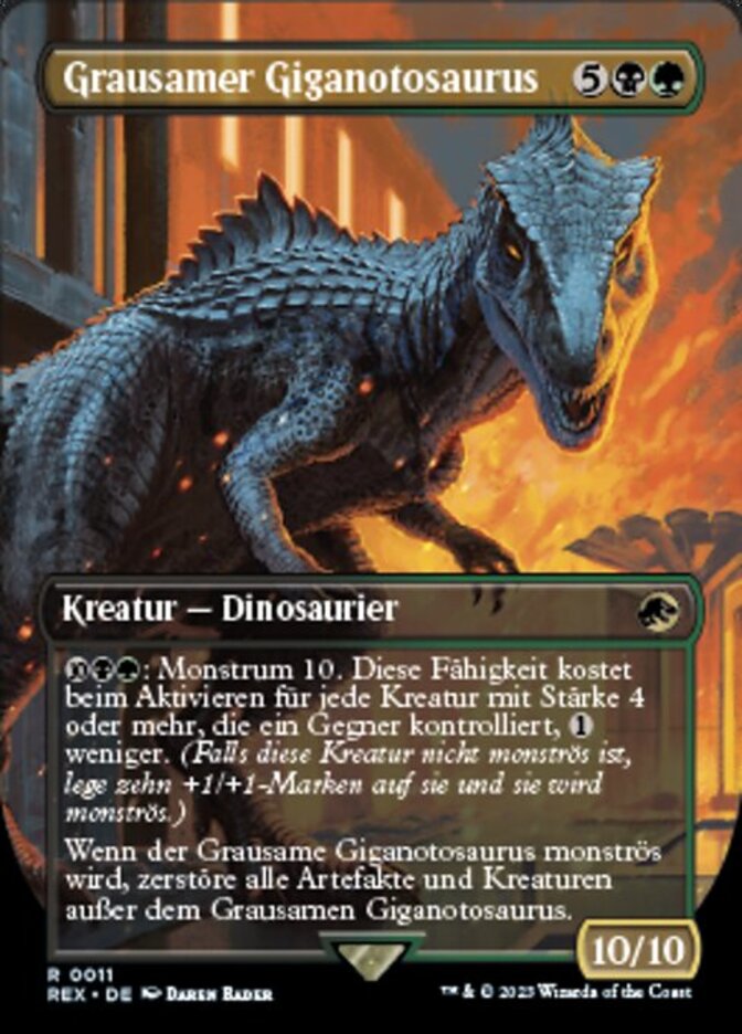 | Rules | : Monstrosity 10. This ability costs less to activate for each creature with power 4 or greater your opponents control. (If this creature isn't monstrous, put ten +1/+1 counters on it and it becomes monstrous.) When Grim Giganotosaurus becomes monstrous, destroy all artifacts and creatures other than Grim Giganotosaurus. |