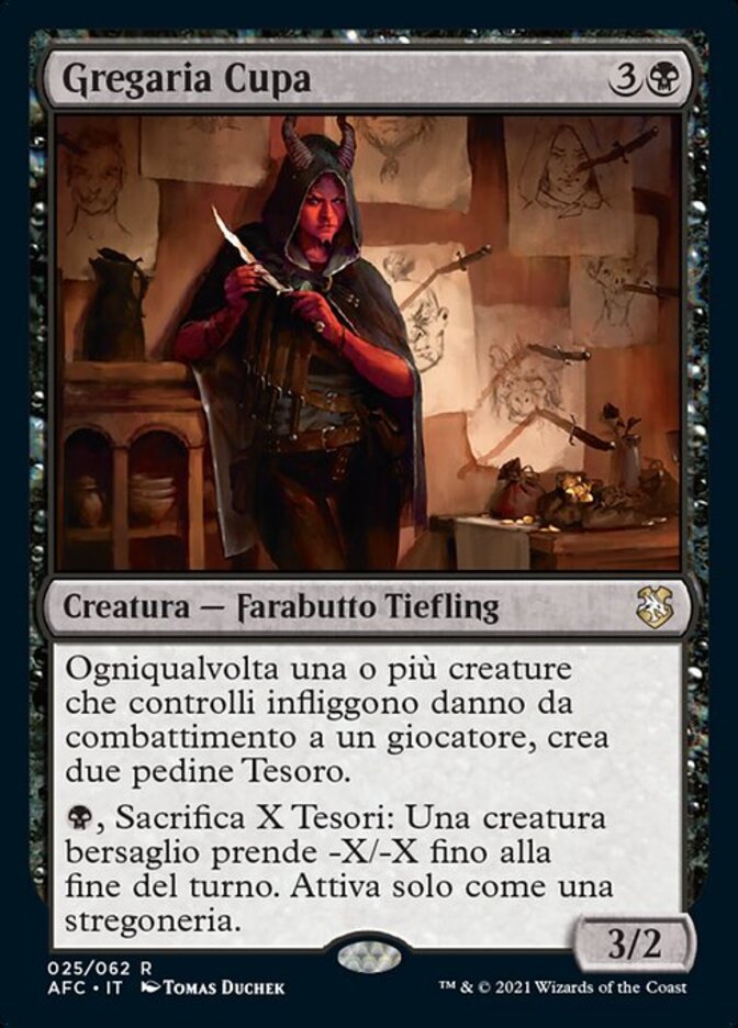 | Rules | Whenever one or more creatures you control deal combat damage to a player, create two Treasure tokens. , Sacrifice X Treasures: Target creature gets -X/-X until end of turn. Activate only as a sorcery. |