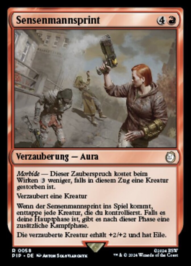 | Rules | Morbid — This spell costs less to cast if a creature died this turn. Enchant creature When Grim Reaper's Sprint enters the battlefield, untap each creature you control. If it's your main phase, there is an additional combat phase after this phase. Enchanted creature gets +2/+2 and has haste. |