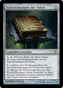 | Rules | , , Discard a card: Put a study counter on Grimoire of the Dead. , Remove three study counters from Grimoire of the Dead and sacrifice it: Put all creature cards from all graveyards onto the battlefield under your control. They're black Zombies in addition to their other colors and types. |