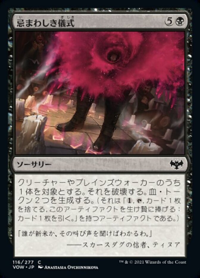 | Rules | Destroy target creature or planeswalker. Create two Blood tokens. (They're artifacts with ", , Discard a card, Sacrifice this artifact: Draw a card.") |