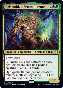 | Rules | Trample At the beginning of your end step, each player creates a 1/1 green Plant creature token. Whenever a creature token dies, put a +1/+1 counter on Grismold, the Dreadsower. |
