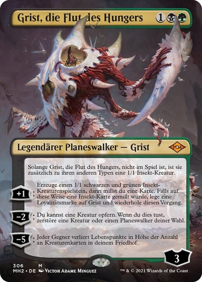 | Rules | As long as Grist, the Hunger Tide isn't on the battlefield, it's a 1/1 Insect creature in addition to its other types. +1: Create a 1/1 black and green Insect creature token, then mill a card. If an Insect card was milled this way, put a loyalty counter on Grist and repeat this process. −2: You may sacrifice a creature. When you do, destroy target creature or planeswalker. −5: Each opponent loses life equal to the number of creature cards in your graveyard. |