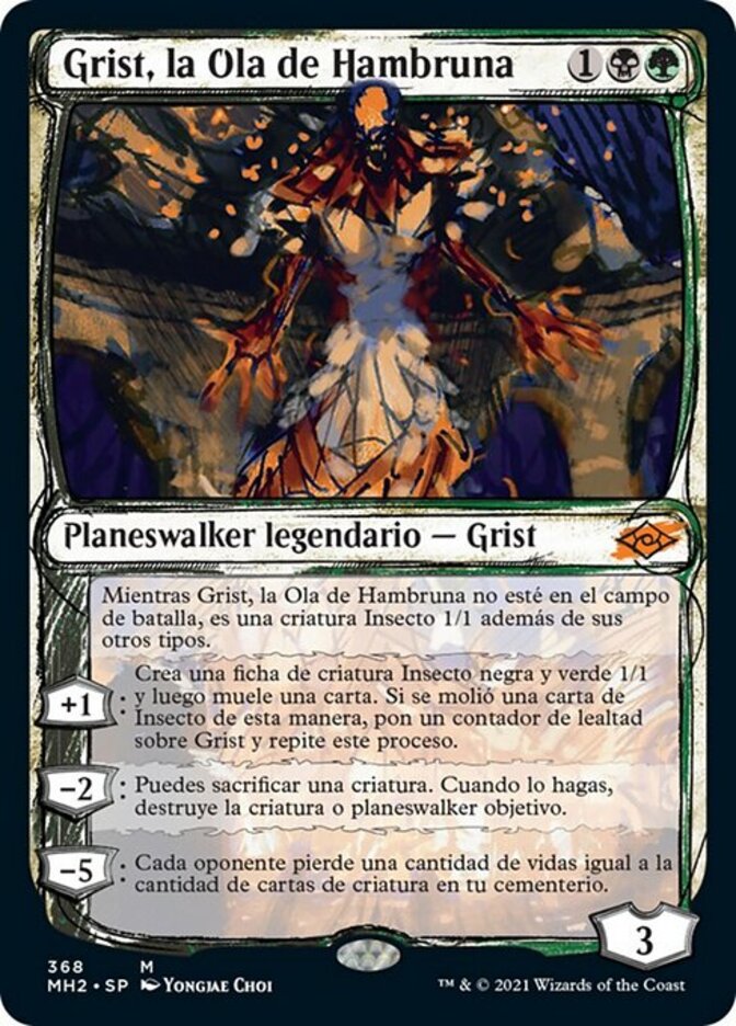 | Rules | As long as Grist, the Hunger Tide isn't on the battlefield, it's a 1/1 Insect creature in addition to its other types. +1: Create a 1/1 black and green Insect creature token, then mill a card. If an Insect card was milled this way, put a loyalty counter on Grist and repeat this process. −2: You may sacrifice a creature. When you do, destroy target creature or planeswalker. −5: Each opponent loses life equal to the number of creature cards in your graveyard. |