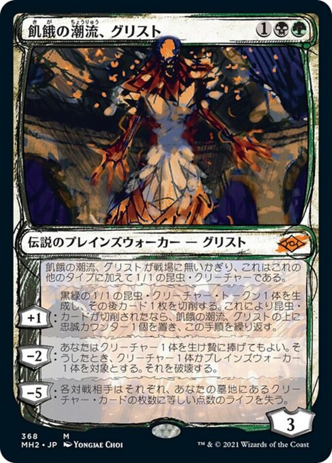 | Rules | As long as Grist, the Hunger Tide isn't on the battlefield, it's a 1/1 Insect creature in addition to its other types. +1: Create a 1/1 black and green Insect creature token, then mill a card. If an Insect card was milled this way, put a loyalty counter on Grist and repeat this process. −2: You may sacrifice a creature. When you do, destroy target creature or planeswalker. −5: Each opponent loses life equal to the number of creature cards in your graveyard. |
