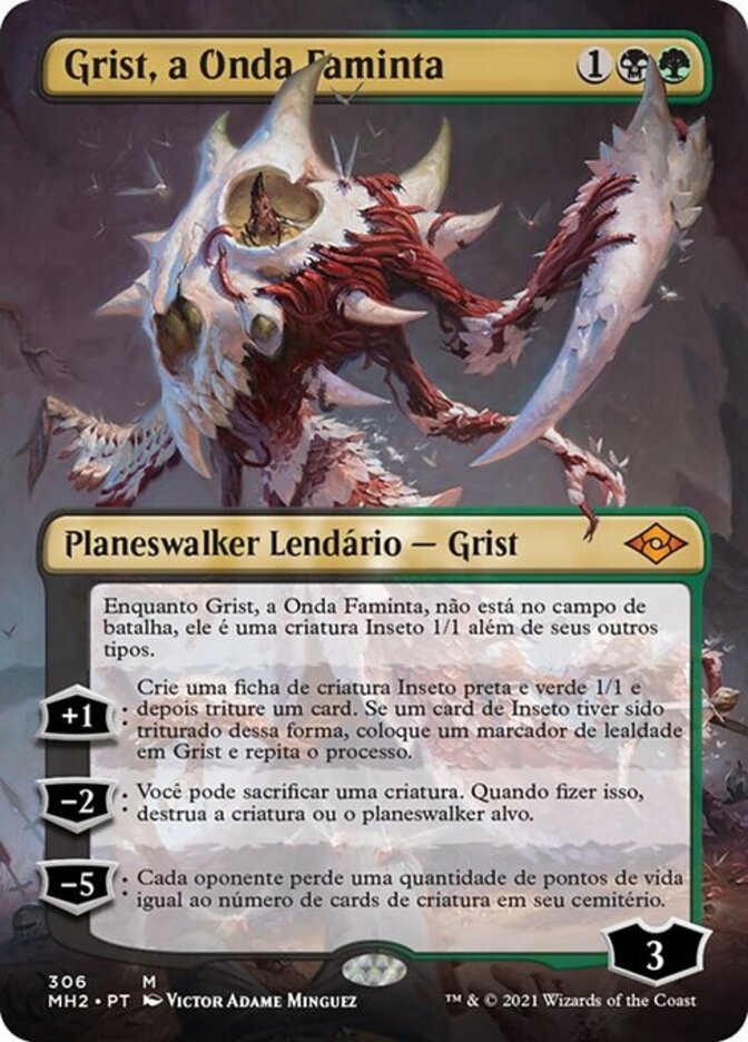 | Rules | As long as Grist, the Hunger Tide isn't on the battlefield, it's a 1/1 Insect creature in addition to its other types. +1: Create a 1/1 black and green Insect creature token, then mill a card. If an Insect card was milled this way, put a loyalty counter on Grist and repeat this process. −2: You may sacrifice a creature. When you do, destroy target creature or planeswalker. −5: Each opponent loses life equal to the number of creature cards in your graveyard. |