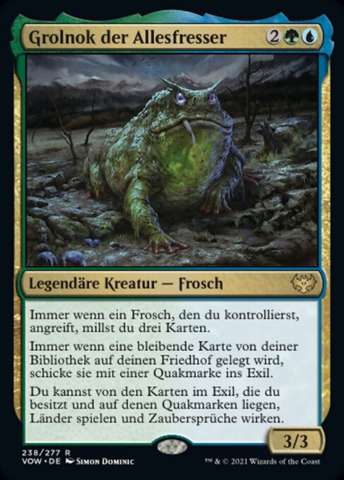 | Rules | Whenever a Frog you control attacks, mill three cards. Whenever a permanent card is put into your graveyard from your library, exile it with a croak counter on it. You may play lands and cast spells from among cards you own in exile with croak counters on them. |