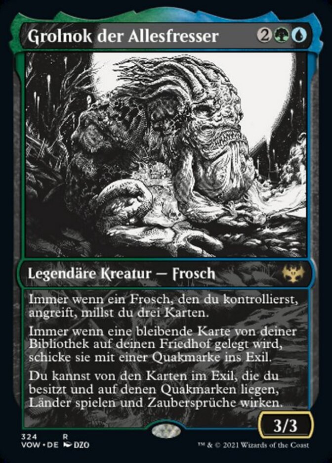 | Rules | Whenever a Frog you control attacks, mill three cards. Whenever a permanent card is put into your graveyard from your library, exile it with a croak counter on it. You may play lands and cast spells from among cards you own in exile with croak counters on them. |