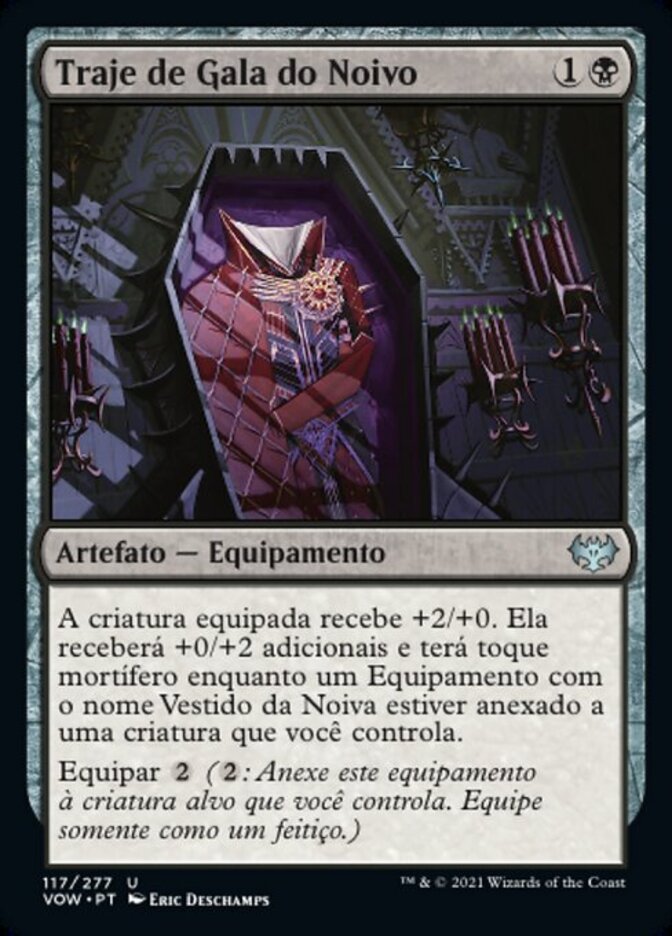| Rules | Equipped creature gets +2/+0. It gets an additional +0/+2 and has deathtouch as long as an Equipment named Bride's Gown is attached to a creature you control. Equip (: Attach to target creature you control. Equip only as a sorcery.) |