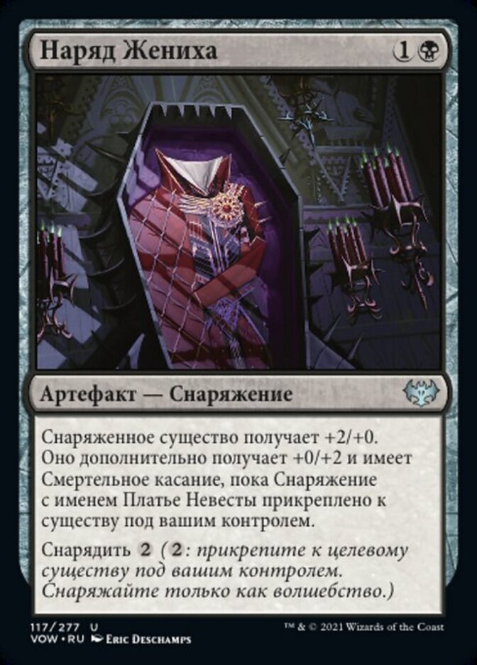 | Rules | Equipped creature gets +2/+0. It gets an additional +0/+2 and has deathtouch as long as an Equipment named Bride's Gown is attached to a creature you control. Equip (: Attach to target creature you control. Equip only as a sorcery.) |