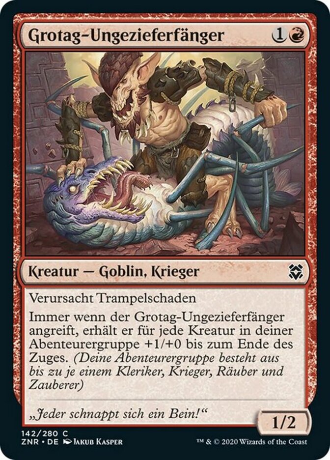 Whenever Grotag Bug-Catcher attacks, it gets +1/+0 until end of turn for each creature in your party. (Your party consists of up to one each of Cleric, Rogue, Warrior, and Wizard.)