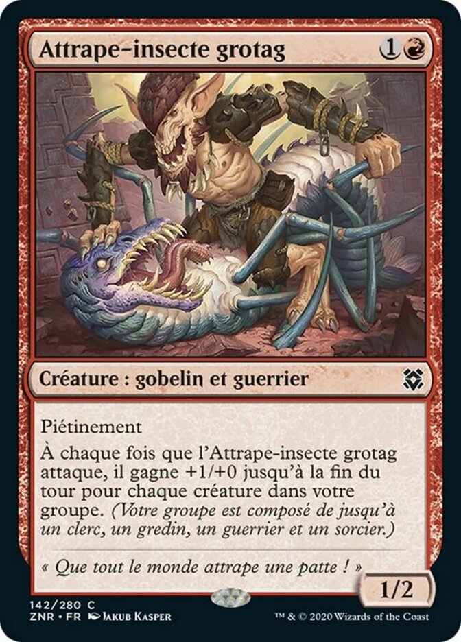 | Rules | Trample Whenever Grotag Bug-Catcher attacks, it gets +1/+0 until end of turn for each creature in your party. (Your party consists of up to one each of Cleric, Rogue, Warrior, and Wizard.) |