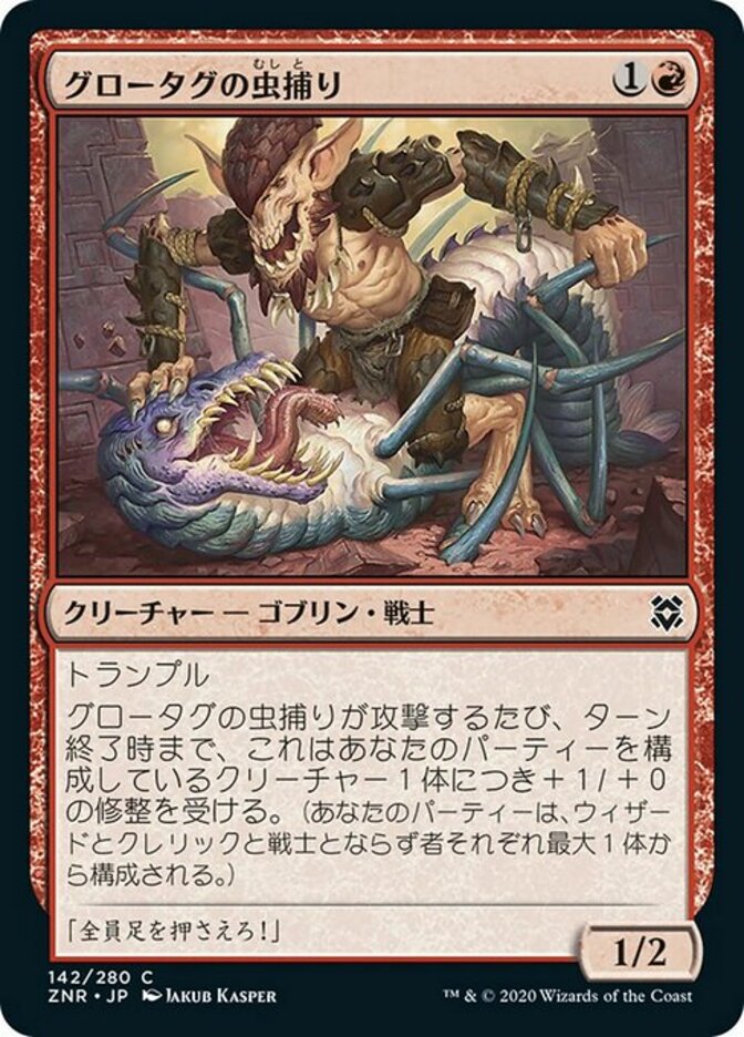 Whenever Grotag Bug-Catcher attacks, it gets +1/+0 until end of turn for each creature in your party. (Your party consists of up to one each of Cleric, Rogue, Warrior, and Wizard.)