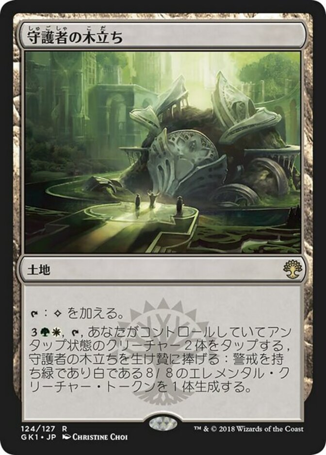 | Rules | : Add . , , Tap two untapped creatures you control, Sacrifice Grove of the Guardian: Create an 8/8 green and white Elemental creature token with vigilance. |