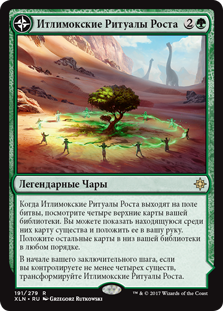 | Rules | When Growing Rites of Itlimoc enters the battlefield, look at the top four cards of your library. You may reveal a creature card from among them and put it into your hand. Put the rest on the bottom of your library in any order. At the beginning of your end step, if you control four or more creatures, transform Growing Rites of Itlimoc. // (Transforms from Growing Rites of Itlimoc.) : Add . : Add for each creature you control. |