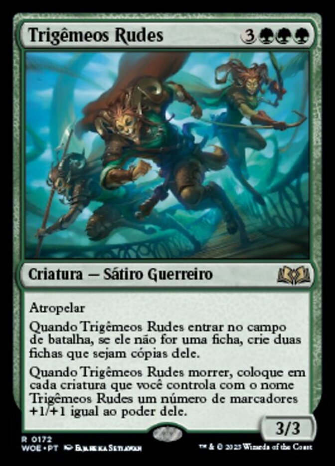 | Rules | Trample When Gruff Triplets enters the battlefield, if it isn't a token, create two tokens that are copies of it. When Gruff Triplets dies, put a number of +1/+1 counters equal to its power on each creature you control named Gruff Triplets. |