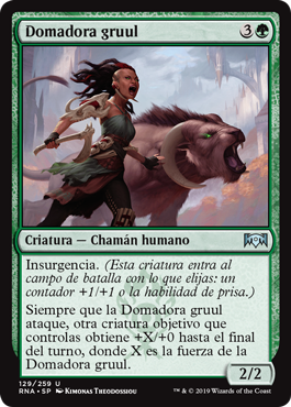 | Rules | Riot (This creature enters the battlefield with your choice of a +1/+1 counter or haste.) Whenever Gruul Beastmaster attacks, another target creature you control gets +X/+0 until end of turn, where X is Gruul Beastmaster's power. |