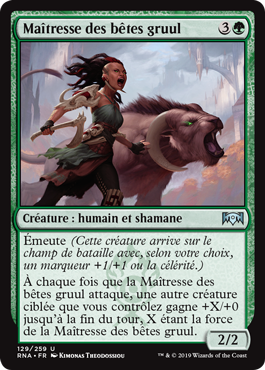 | Rules | Riot (This creature enters the battlefield with your choice of a +1/+1 counter or haste.) Whenever Gruul Beastmaster attacks, another target creature you control gets +X/+0 until end of turn, where X is Gruul Beastmaster's power. |