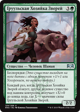 | Rules | Riot (This creature enters the battlefield with your choice of a +1/+1 counter or haste.) Whenever Gruul Beastmaster attacks, another target creature you control gets +X/+0 until end of turn, where X is Gruul Beastmaster's power. |