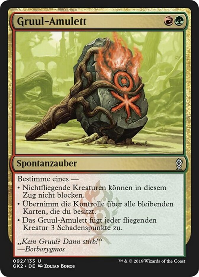 | Rules | Choose one — • Creatures without flying can't block this turn. • Gain control of all permanents you own. • Gruul Charm deals 3 damage to each creature with flying. |