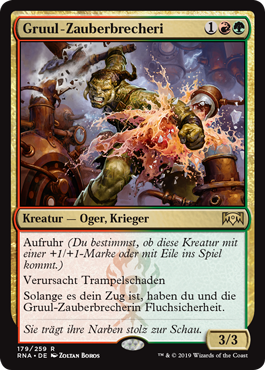 | Rules | Riot (This creature enters the battlefield with your choice of a +1/+1 counter or haste.) Trample As long as it's your turn, you and Gruul Spellbreaker have hexproof. |