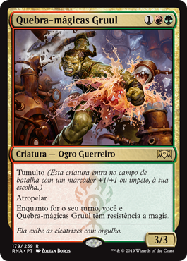 | Rules | Riot (This creature enters the battlefield with your choice of a +1/+1 counter or haste.) Trample As long as it's your turn, you and Gruul Spellbreaker have hexproof. |