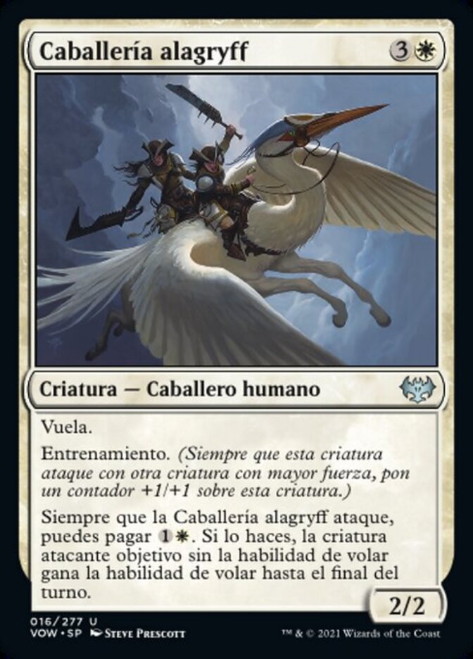 | Rules | Flying Training (Whenever this creature attacks with another creature with greater power, put a +1/+1 counter on this creature.) Whenever Gryffwing Cavalry attacks, you may pay . If you do, target attacking creature without flying gains flying until end of turn. |