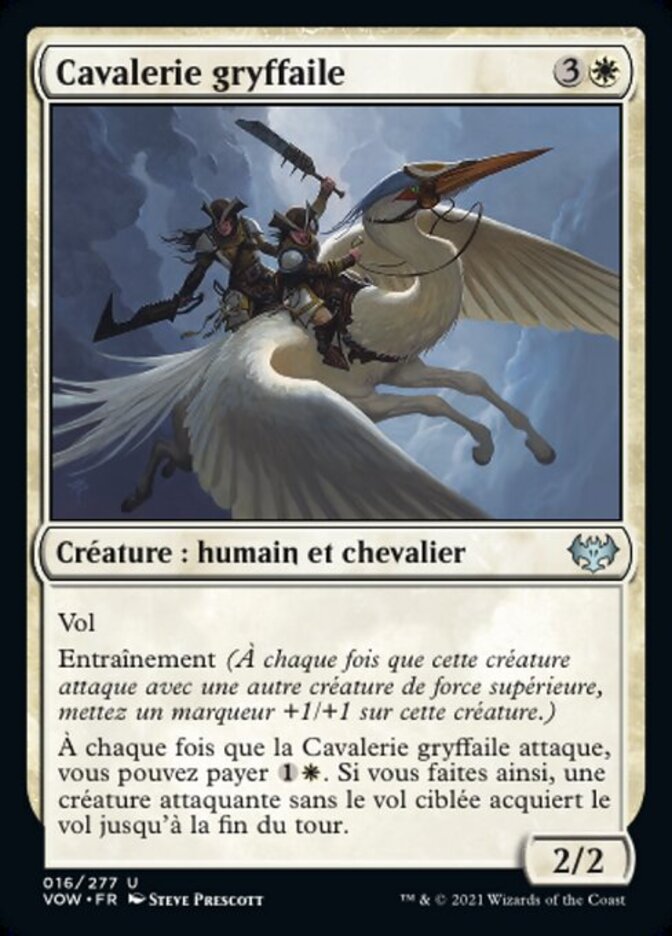 | Rules | Flying Training (Whenever this creature attacks with another creature with greater power, put a +1/+1 counter on this creature.) Whenever Gryffwing Cavalry attacks, you may pay . If you do, target attacking creature without flying gains flying until end of turn. |