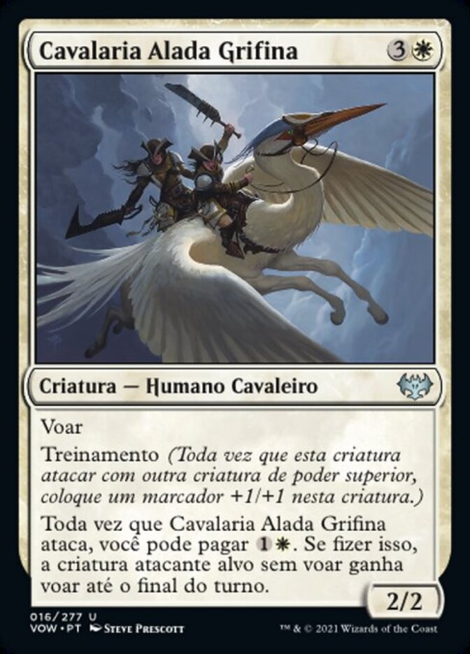 | Rules | Flying Training (Whenever this creature attacks with another creature with greater power, put a +1/+1 counter on this creature.) Whenever Gryffwing Cavalry attacks, you may pay . If you do, target attacking creature without flying gains flying until end of turn. |