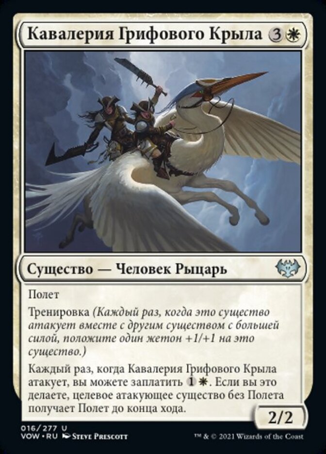 | Rules | Flying Training (Whenever this creature attacks with another creature with greater power, put a +1/+1 counter on this creature.) Whenever Gryffwing Cavalry attacks, you may pay . If you do, target attacking creature without flying gains flying until end of turn. |