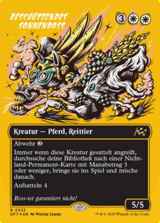 | Rules | Ward Whenever this creature attacks while saddled, search your library for a nonland permanent card with mana value 3 or less, put it onto the battlefield, then shuffle. Saddle 4 |