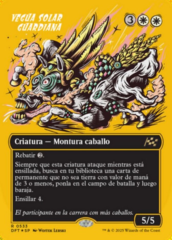 | Rules | Ward Whenever this creature attacks while saddled, search your library for a nonland permanent card with mana value 3 or less, put it onto the battlefield, then shuffle. Saddle 4 |