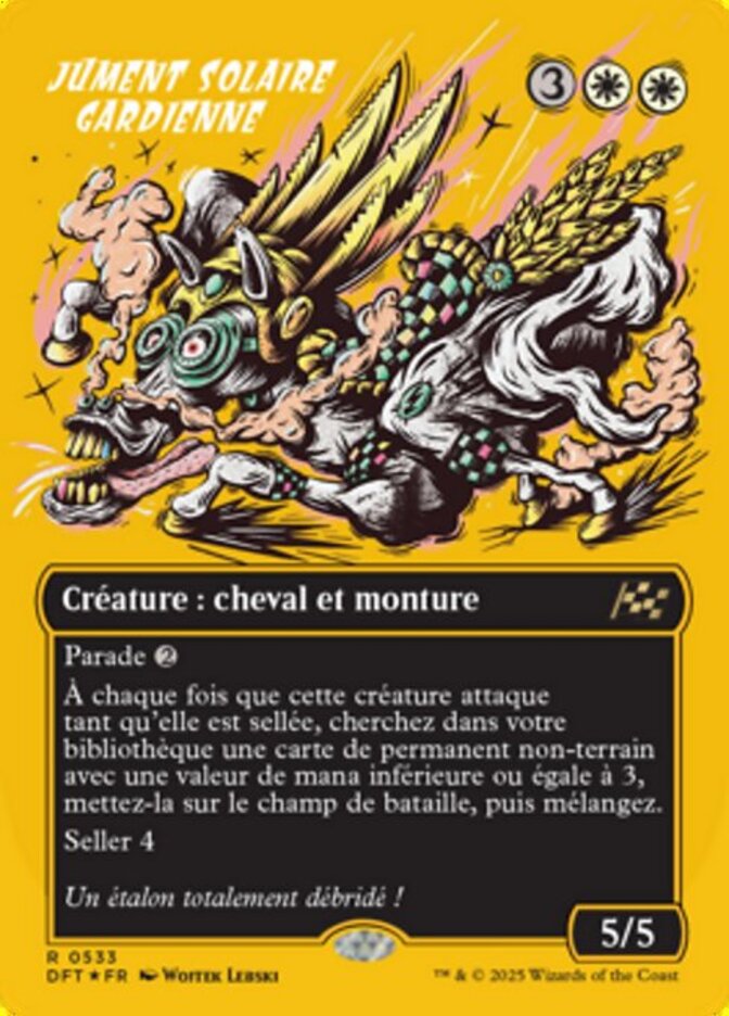 | Rules | Ward Whenever this creature attacks while saddled, search your library for a nonland permanent card with mana value 3 or less, put it onto the battlefield, then shuffle. Saddle 4 |
