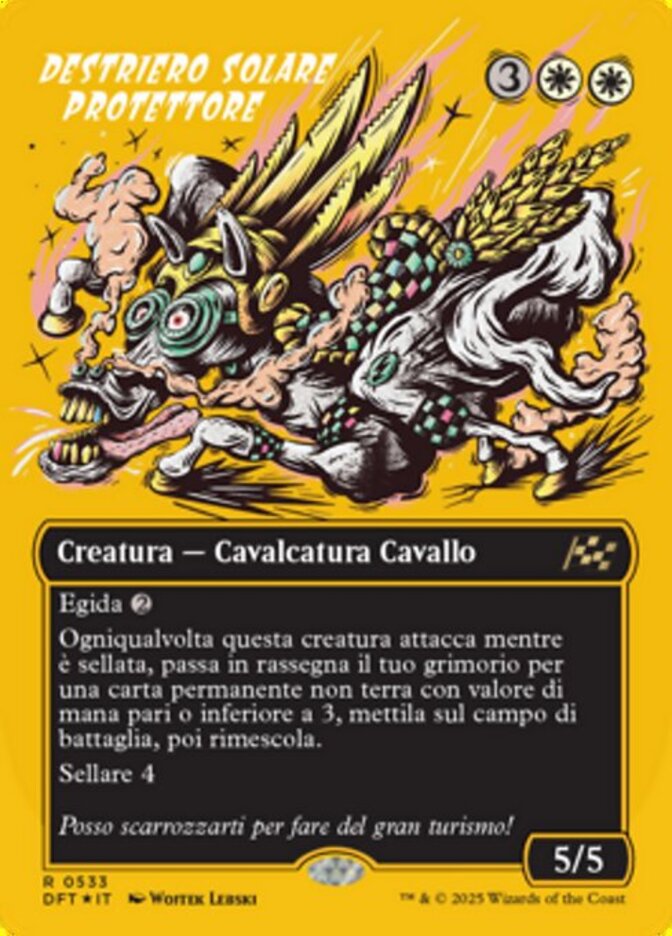 | Rules | Ward Whenever this creature attacks while saddled, search your library for a nonland permanent card with mana value 3 or less, put it onto the battlefield, then shuffle. Saddle 4 |