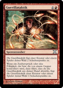 | Rules | Guerrilla Tactics deals 2 damage to any target. When a spell or ability an opponent controls causes you to discard Guerrilla Tactics, Guerrilla Tactics deals 4 damage to any target. |