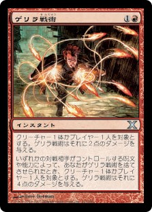 | Rules | Guerrilla Tactics deals 2 damage to any target. When a spell or ability an opponent controls causes you to discard Guerrilla Tactics, Guerrilla Tactics deals 4 damage to any target. |
