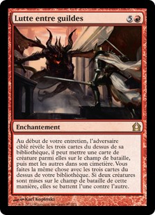 | Rules | At the beginning of your upkeep, target opponent reveals the top three cards of their library, may put a creature card from among them onto the battlefield, then puts the rest into their graveyard. You do the same with the top three cards of your library. If two creatures are put onto the battlefield this way, those creatures fight each other. |