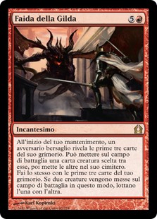 | Rules | At the beginning of your upkeep, target opponent reveals the top three cards of their library, may put a creature card from among them onto the battlefield, then puts the rest into their graveyard. You do the same with the top three cards of your library. If two creatures are put onto the battlefield this way, those creatures fight each other. |