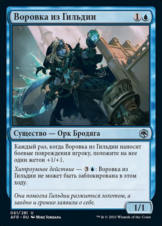 | Rules | Whenever Guild Thief deals combat damage to a player, put a +1/+1 counter on it. Cunning Action — : Guild Thief can't be blocked this turn. |