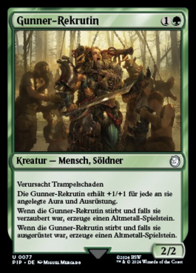 | Rules | Trample Gunner Conscript gets +1/+1 for each Aura and Equipment attached to it. When Gunner Conscript dies, if it was enchanted, create a Junk token. When Gunner Conscript dies, if it was equipped, create a Junk token. |