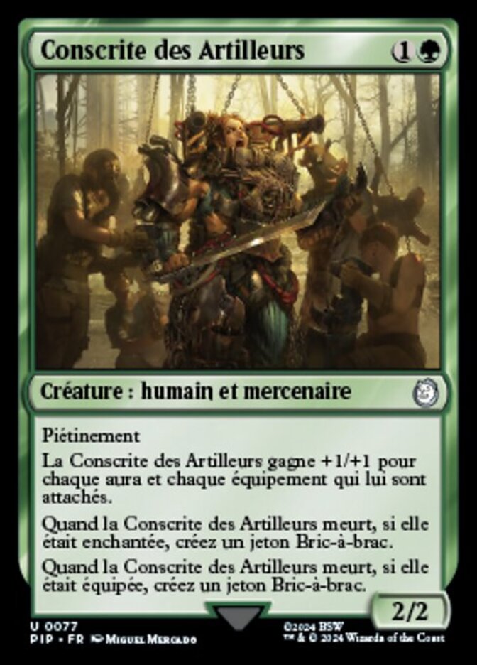| Rules | Trample Gunner Conscript gets +1/+1 for each Aura and Equipment attached to it. When Gunner Conscript dies, if it was enchanted, create a Junk token. When Gunner Conscript dies, if it was equipped, create a Junk token. |
