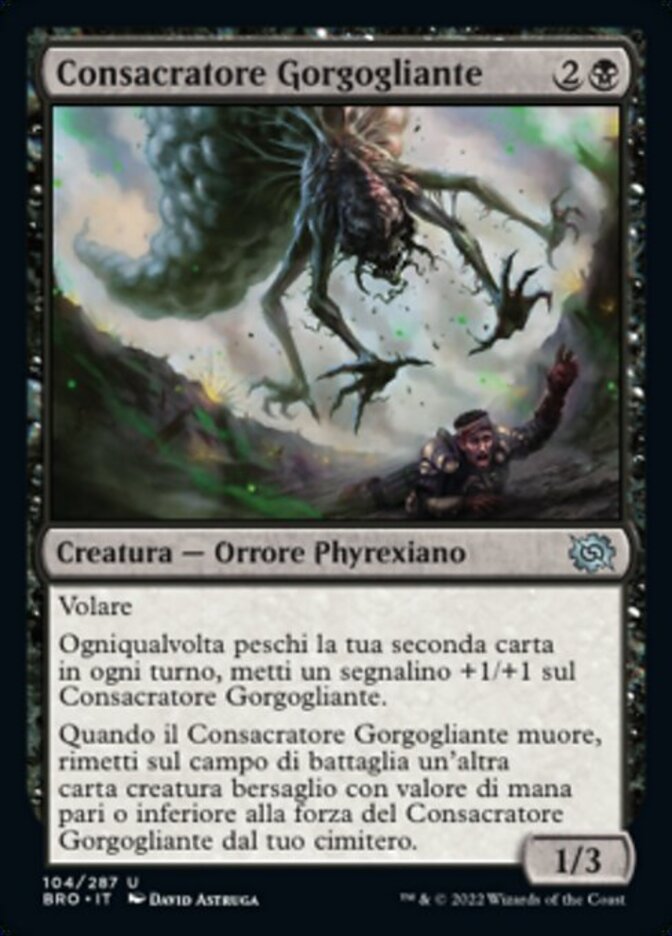 | Rules | Flying Whenever you draw your second card each turn, put a +1/+1 counter on Gurgling Anointer. When Gurgling Anointer dies, return another target creature card with mana value less than or equal to Gurgling Anointer's power from your graveyard to the battlefield. |