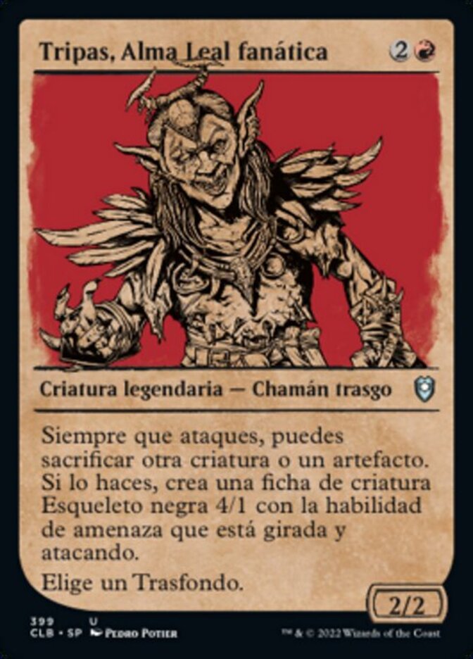 | Rules | Whenever you attack, you may sacrifice another creature or an artifact. If you do, create a 4/1 black Skeleton creature token with menace that's tapped and attacking. Choose a Background (You can have a Background as a second commander.) |