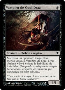 | Rules | As long as an opponent has 10 or less life, Guul Draz Vampire gets +2/+1 and has intimidate. (It can't be blocked except by artifact creatures and/or creatures that share a color with it.) |